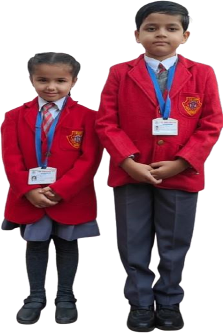 Boys: - Steel grey trousers, white full-sleeved shirt, school tie, steel grey “V” neck pullovers, school belt, scarlet red blazer, steel grey woollen socks, plain black shoes.